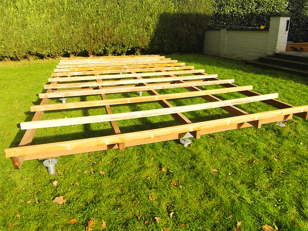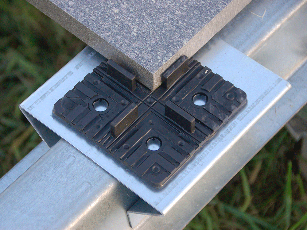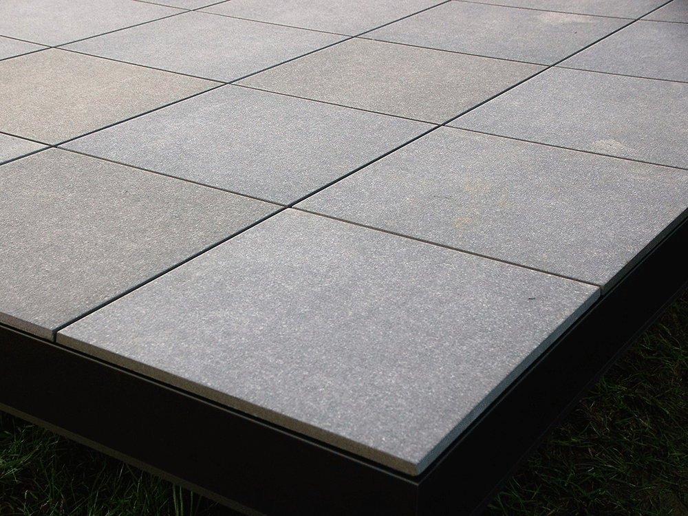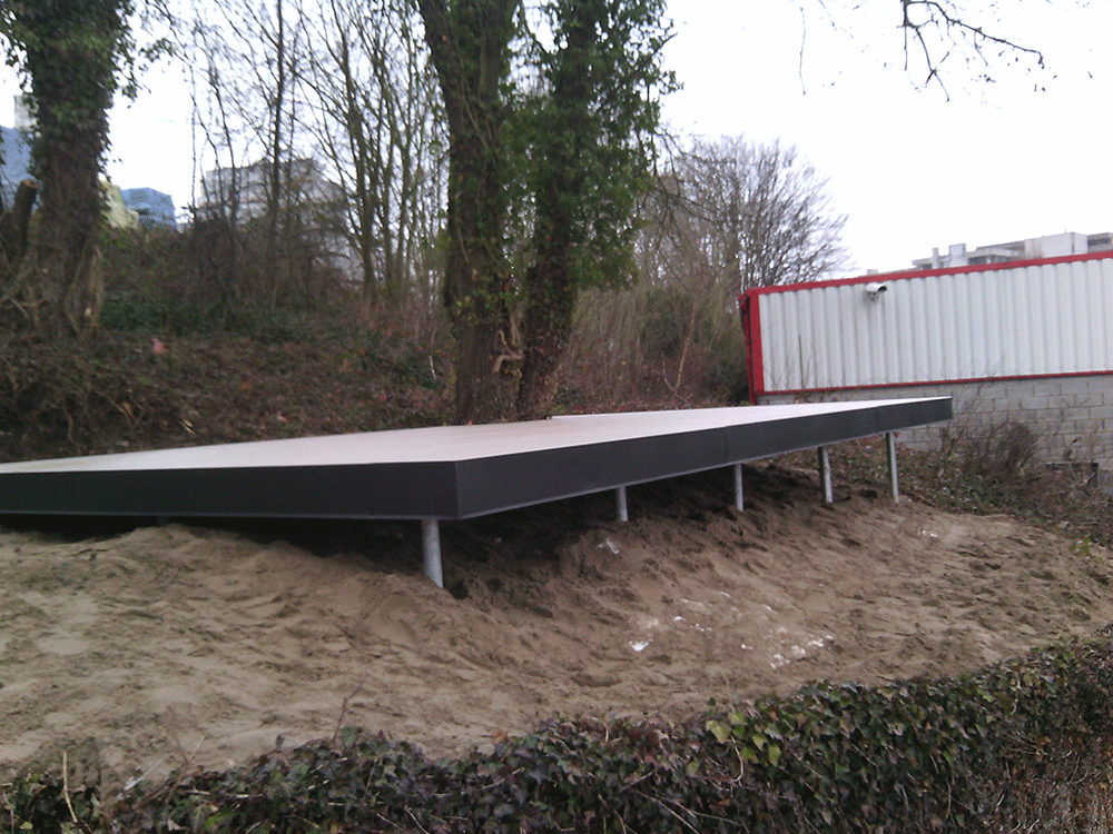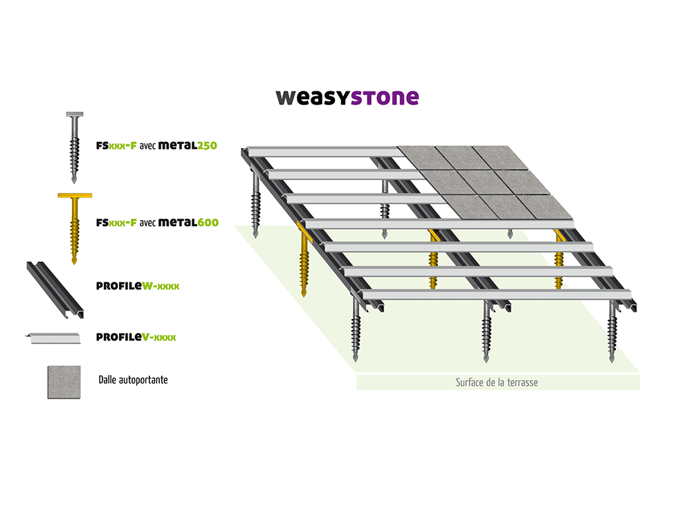 Indien u noch de mogelijkheid , noch de tijd hebt om een betonplaat te storten of een ondergrond in stabilisé te realiseren, bestaat er een innoverende oplossing : Weasyfix. Dankzij het syteem van ingeboorde schroeven in de grond, gecombineerd met een metalen structuur , is het nu mogelijk om te genieten van een betegeld terras in amper enkele dagen.
